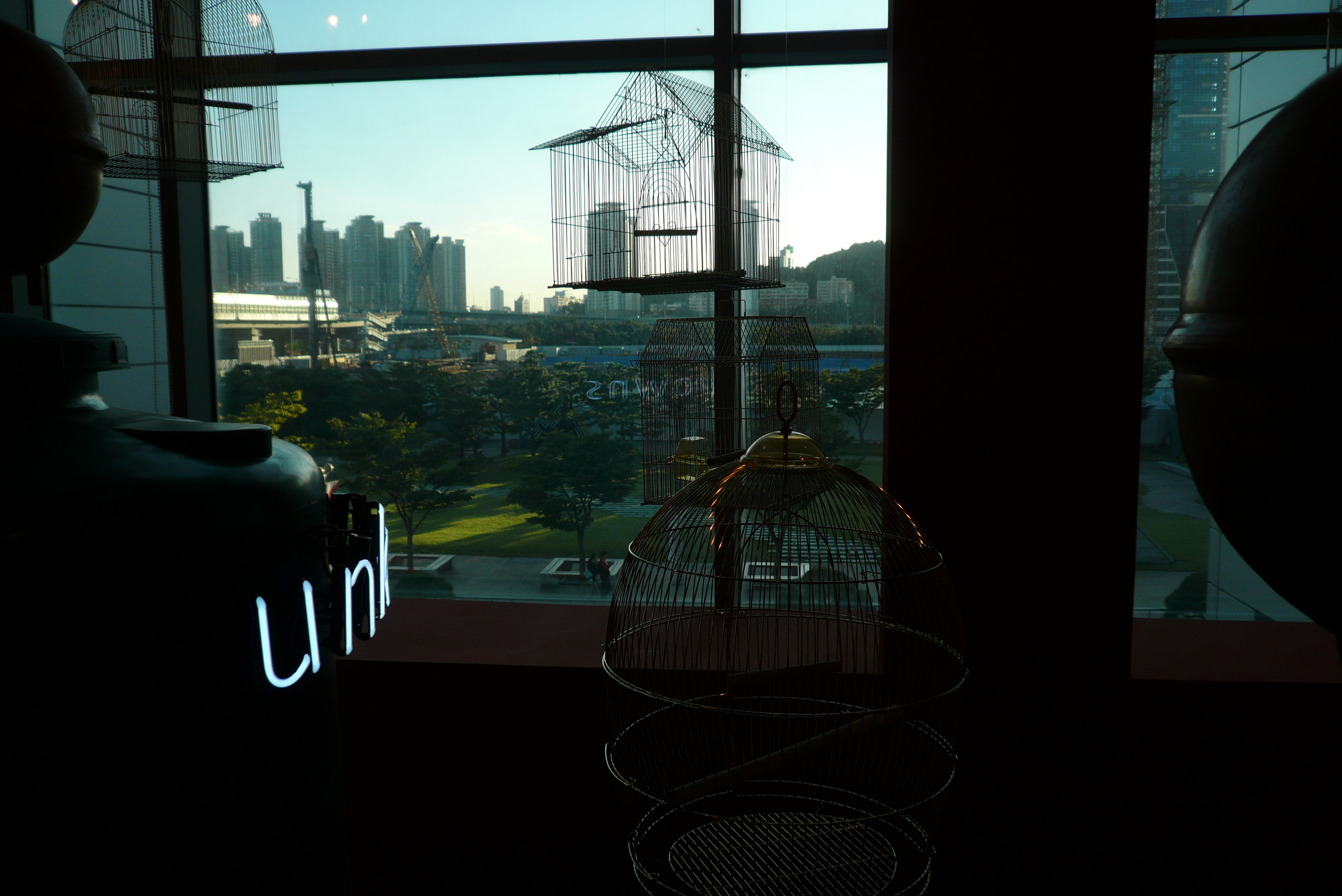 Tae Hun Kang looks into political and social issues from his critical perspective and create installations using found objects in his surroundings. The use of birdcages aims at the allegorical representation of the ills of modern way of living such as'Hikikomori'.