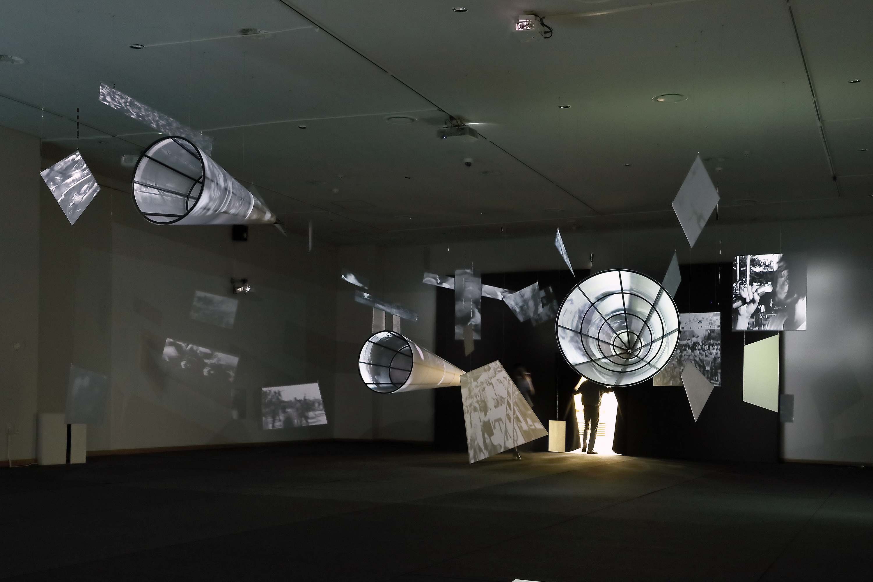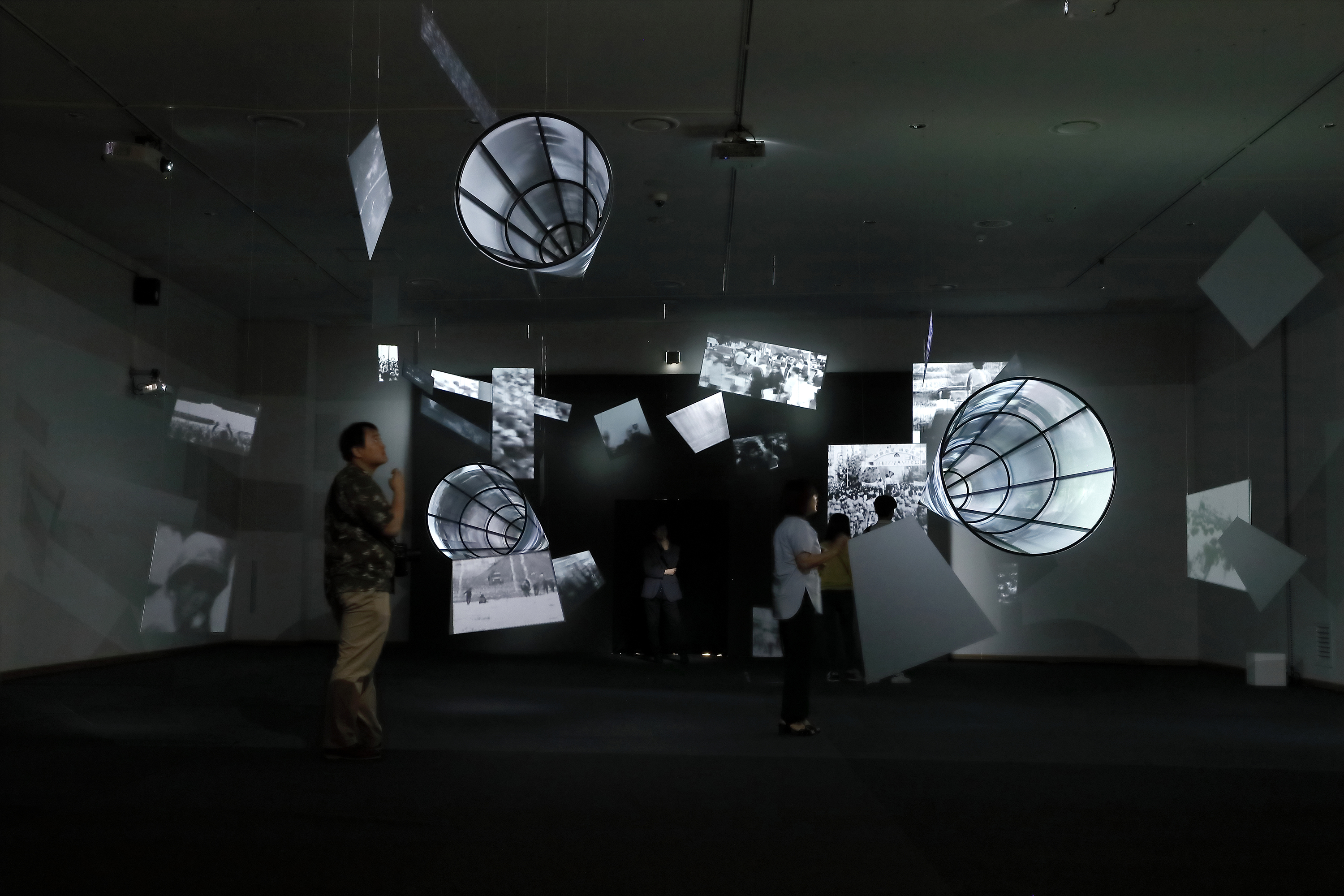 이 공간을 지나 정면에는 주체화된 세계 인민들의 저항을 담은 재편집된 기록영상이 투사되는데, 이는 고양된 현실을 수평적 차원에서 인지할 수 있는 장치로 삼은 것이다. 영상들은 정치적인 입장에 따라 선택되었으며, 유보적이거나 유효한 것으로 분류되었다. 이는 프로젝션 매핑을 통해 기하학적 스크린에 각각 배치되어 투사된다. 반복되는 영상들은 단순한 콜라주를 넘어 역사적 사건들의 차이를 드러내면서도 하나의 통일체로 엮어낸다. 그것들은 현실화되지 못한 실패를 딛고 생존하는 이념의 공간을 만들어낸다.