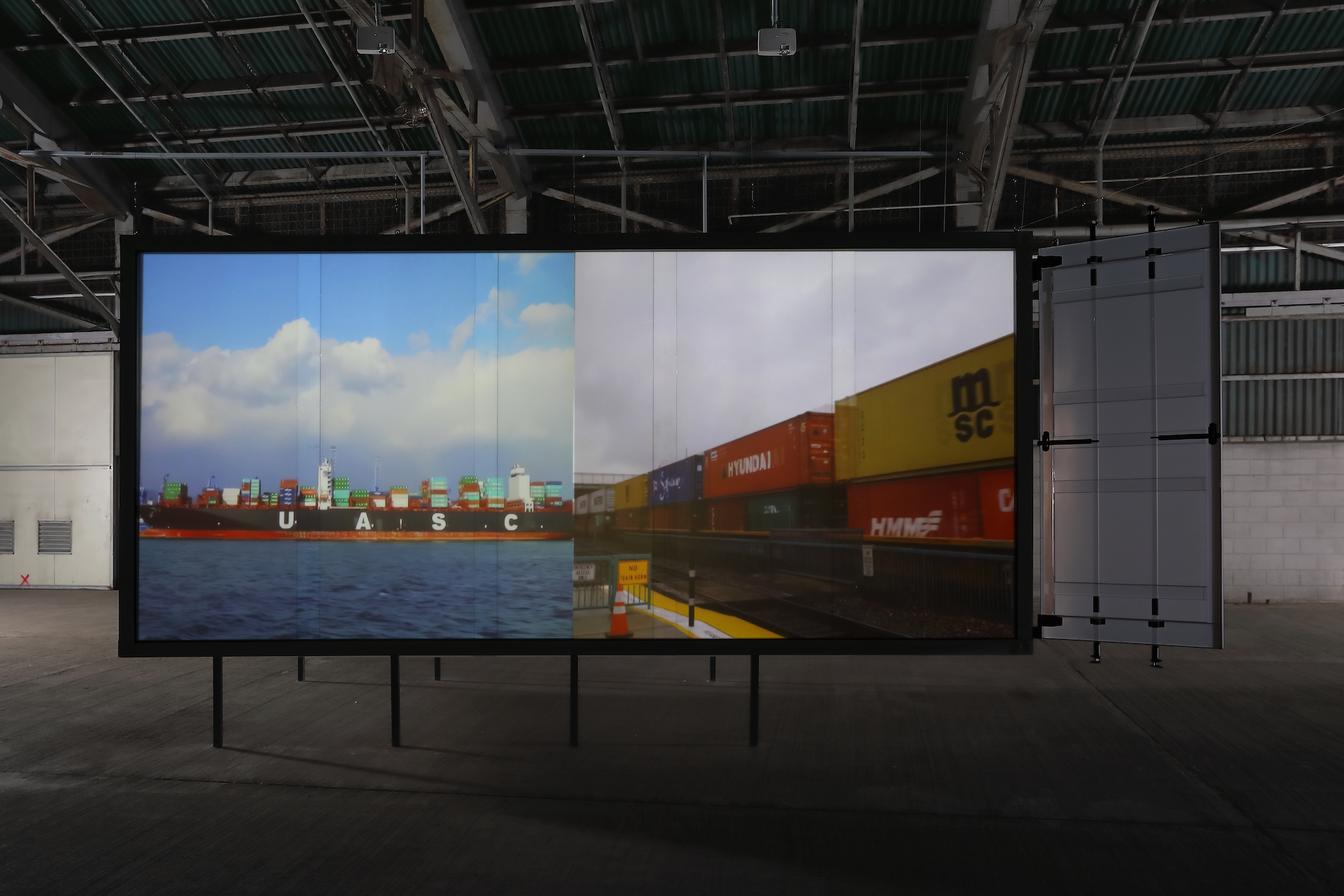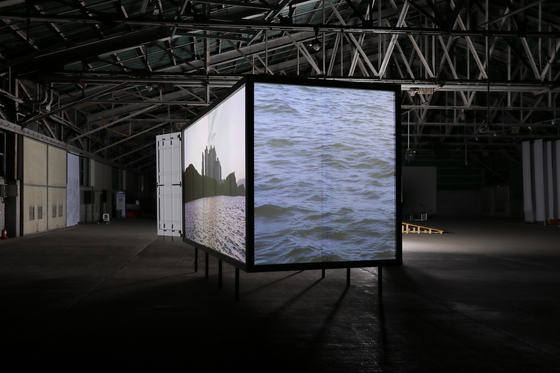Projected on a structure shaped like a shipping container, Kang’s work begins with images of explosions from the wars that plagued the world long since the past. Kang then goes on to capture the history of Busan, the transformation of the city’s industries and architecture, incidents and people, and the bodies of migrant workers. Meanwhile, the locations, events, and subjects that Kang personally experienced are overlaid across different locations and points in time. The mutually intrusive and resonating images stacked atop the container capture the history of cities and humanity much like a map inked on parchment. Originating in World War II, shipping containers became a staple in Busan during the Korean War as the city was transformed into a modern hub of logistics. Evolving throughout the Japanese occupation, Korean War, Cold War, and the near-completion of pan-global capitalism today, Busan has proven to be a valuable city geopolitically at first, but now also geoeconomically as it functions as one of the key logistics hubs in the global trade network. Freedom is now something enjoyed not by people, but commodities.